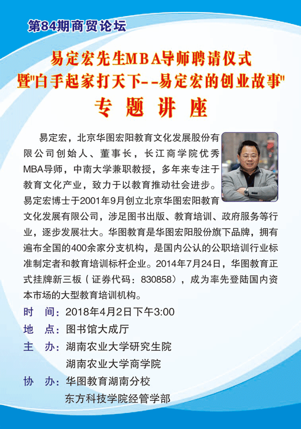 第84期商贸论坛:易定宏先生MBA导师聘请仪式暨“白手起家打天下——易定宏的创业故事”专题讲座